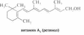 Вітамін А був відкритий Н. Друммонду в 1916 р Цьому відкриттю передували спостереження про наявність жиророзчинного фактора в їжі, необхідної для нормального розвитку сільськогосподарських тварин. Надалі було встановлено, що є три вітаміну групи А: ретинол, або вітамін Aj, нсорстінол - стсрсоізомср А, і А ,. Цей вітамін необхідний не тільки тваринам, але і людині, і при його дефіциті у людини з'являються захворювання очей - ксерофтальмія і гемеролапія. Вітаміни групи А містяться тільки в тваринних продуктах, таких, як печінка, риб'ячий жир, вершкове масло та ін. В рослинній їжі містяться каротиноїди, здатні попереджати А-авітаміноз. При надходженні в організм людини або тварин вони під впливом ферменту каротінази перетворюються в вітамін А ,. Ретинол є неграничний одноатомний спирт, що складається з 0--иононового кільця, а також бічного ланцюга, що містить два залишки ізопрену і первинну спиртову групу: