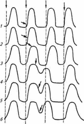 У, 2, 3 - штучне роздратування наносять під час скорочення шлуночків, тому ефекту немає (абсолютна рефрактерна фаза); 4, 5, 6-роздратування наносять під час розслаблення мишіи і викликають появу екстрасистол. амплітуда яких тим більше, чим пізніше в період розслаблення нанесено роздратування. Це пов'язано зі зміною збудливості мишіи, наступаючим після порушення; прямі стрілки і пунктирні лінії вказують момент появи імпульсів в синусовому вузлі, бічні - момент штучного подразнення серця