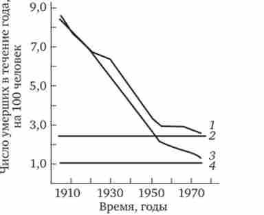 Практичне застосування закону Гомперца - Мейкема дає точне уявлення про природу чинників, що обумовлюють відмінність в інтенсивності смертності людей з різних популяцій або ж з однієї популяції, але в різний історичний час. На рис. 8.41 показано, як змінювалася загальна смертність (1), а також соціальна (2) і біологічна (3) її компоненти в популяції 40-річних жінок Фінляндії в інтервалі з 1890 по 1970 р, т. Е. В період