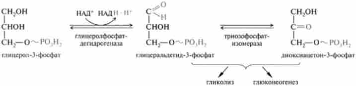 Гліцерин-3-фосфат (активована форма глііерола) дегидрирующей, при дії НАД * -залежною гліцеролфосфатдегідрогенази, а утворюються тріозофосфати або далі метаболизируют по шляху гліколізу, або залучаються до процесу глюконеогенезу (синтез глюкози):