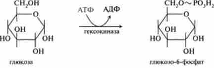 У всіх клітинах, здатних метаболизировать глюкозу, першою реакцією є її фосфорилювання до глюкозо-6-фосфату. Реакція каталізується ферментом гексокінази, а донором фосфорильної групи є молекула АТФ: