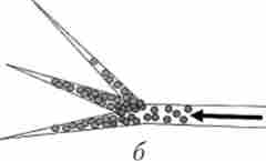 Крім того, всі емболізірующіе матеріали відрізняються за формою і розміром (від 50 мкм до декількох сантиметрів). Великі емболізати (металеві спіралі, окклюдером) використовують для проксимальної оклюзії або закриття патологічних соустий (артеріовенозні соустя, пороки розвитку серцево-судинної системи) (див. Рис. 29.1, г, і Мал. 29.6, а). Дрібні частинки використовують для дистальної оклюзії. При цьому чим менше розмір частки, тим дрібніше калібр окклюзіруемого судини (див. Рис. 29.1, д; Мал. 29.6, б).