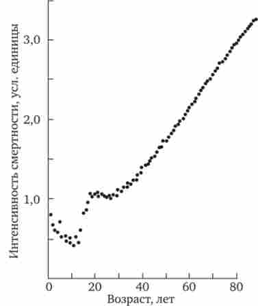 Наведені відомості вказують на очевидну залежність тривалості життя від соціально-економічних умов. Чи означає це, що зміни соціально-економічних умов в сторону їх поліпшення уповільнюють швидкість старіння? Залежність смертності людей від віку показана на рис. 8.36. По ходу наведеної кривої спостерігаються три відрізка, що розрізняються по інтенсивності і напрямку зміни смертності.