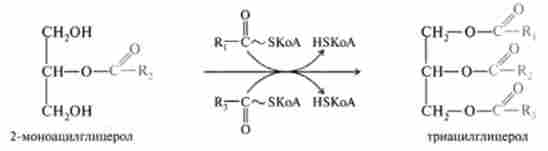 З моноаціл Гліцерол і жирних кислот в епітеліальних клітинах знову синтезуються триацилгліцеролів. Найбільш простий шлях синтезу ліпідів, так званий p-моногліцерідний шлях, включає дві послідовні реакції етерифікації (3 (2) -моноацілгліцерола активованими жирними кислотами в формі ацил-КоА за схемою: