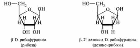 Вуглеводна частина нуклеотидів, що входять в РНК, представлена рибозой, а що входять в ДНК, - дезоксирибозою. Пентози в нуклеїнових кислотах завжди присутні в p-D-фуранозной формі: