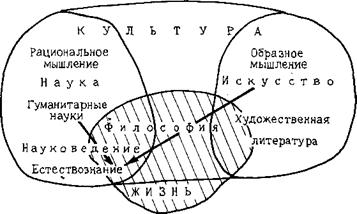 Для стережуть існує єдиний і всезагальний космос (із сплячих леї кожен відвертається у свій власний) Геракліт 1 Особливість пропонованого дослідження - в тому, що наука береться в ньому не тільки як сума ідей, дослідів, знань, але і як наукова література, а кожне наукове твір розглядається не тільки як виклад певних поглядів на явище природи, але і як текст на природній мові, де образ і стиль мають фундаментально-визначальне значення для воссоздаваемой картини світу і побудов теорії. Цим наука включається в усі поле національної культури даного народу, а в мисленні натуралістів виявляються гуманітарні, естетичні моменти, що ріднять природознавство з мистецтвом, з художньою літературою. Але тут природний і зворотний, симетричний хід: лише тому око дослідника змогло розглянути науковий твір як літературний текст, що дослідником допущена така можливість. Цей 'же підхід застосуємо і до самого досліднику: можна і свою наукову роботу створювати як літературний текст, що має право на індивідуальний стиль, і поряд з розсудливим аналізом вдаватися до операції синтезу, до образного мислення. Таким чином, перед нами - міждисциплінарне дослідження (і тому воно виходить за закони кожної дисципліни) на стику природознавства і мистецтвознавства. Але не тільки. Ось схема 1 (рис. 1), і на ній заштрихована зона, що пояснить точку, а, вірніше, поле зорі, на якому знаходиться автор: що йому звідти мабуть і як може представлятися. Вихідним є уявлення про цілісність культури н її зв'язках з історією суспільства і життям особистості. Автор, філолог але первісним утворенню та діяльності, працюючи в галузі теорії літератури, естетики та культурології, весь час розширюючи поле своїх Рис. 1 занять, вийшов на проблему розірваності культури на гуманітарну та природничо сфери, які все більш розходяться, відокремлюються, спеціалізуються і навіть деколи войовничо не хочуть знати один про одного, про свій братерство і взаємопроникнення. Якщо і було в нашому столітті взаємнопроникна рух, то воно йшло з боку точних наук, математики і техніки: в гуманітарних науках стали застосовувати точні математичні методи (в семіотики, структуралізмі і т. д.), мистецтво тлумачилося як технічний «прийом», письменникам стало утішно називатися «інженерами людських душ». Захват технічним прогресом захопило багатьох: «в електриці і парі любові до людини більше ...» (Чехов). Тим часом суперечності науково-технічного прогресу - ті, які в XVIII столітті, на його зорі, передчував Руссо, розкрилися в середині XX в. з жахливою силою (ядерна техніка, генна інженерія, екологія і т. д.). Гуманітарний знання, ще недавно яке мало «комплекс неповноцінності» перед могутнім натиском природознавства і техніки, починає піднімати голову і вживає зустрічний рух в область гордовитого «точного» знання, запідозривши: вже так чи воно «точно», загальнозначуще, як про собі уявляє, чи немає там ціннісних і образних, суб'єктивних, особистісних моментів, що мають витоком життя суспільства, народу, особистості? Наука стала піддавати себе рефлексії - і розвинулося наукознавство, а в самосвідомості науки все більшого значення набувають соціокультурні дослідження, розглядають науку в контексті своєї епохи, в системі культури. У цьому руслі лежить і справжнє дослідження. Дані природничих наук допускають різну комбина