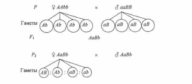 Як показує схема, в F утворюється новий ознака - все цибулини мають червоне забарвлення. В F2 з'являються рослини з червоними (9/16), жовтими (3/16) і білими (4/16) цибулинами.