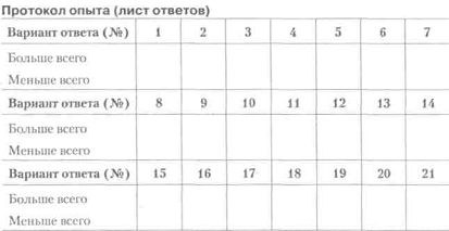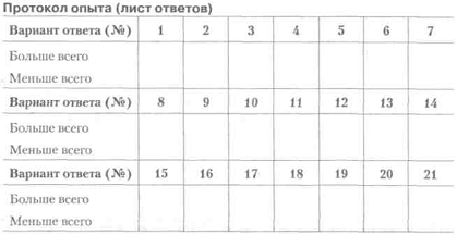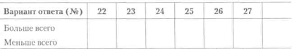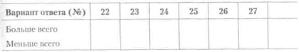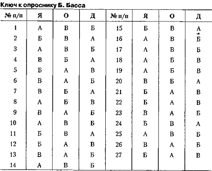 Опитувальник Б. Басса 1. Найбільше задоволення я отримую від: а) схвалення моєї роботи; б) свідомості того, що робота зроблена добре; в) свідомості того, що мене оточують друзі. 2. Якби я грав у футбол (волейбол, баскетбол), то я хотів би бути: а) тренером, який розробляє тактику гри; б) відомим гравцем; в) обраним капітаном команди. 3. По-моєму, кращим педагогом є той, хто: а) проявляє інтерес до учнів і до кожного має індивіду альний підхід; б) викликає інтерес до предмета, так що учні з удовольст Вієм поглиблюють свої знання в цьому предметі; в) створює в навчальному колективі таку атмосферу, при якій ніхто не боїться висловити свою думку. 4. Мені подобається, коли люди: а) радіють виконану роботу; б) із задоволенням працюють у колективі; в) прагнуть виконати свою роботу краще за інших. 5. Я хотів би, щоб мої друзі: а) були чуйні і допомагали людям, коли для цього представ ляють можливості; б) були вірними віддані мені; в) були розумними і цікавими людьми. 6. Кращими друзями я вважаю тих: а) з ким складаються хороші взаємини; б) на кого завжди можна покластися; в) хто може багато чого досягти в житті. 7. Найбільше я не люблю: а) коли у мене щось не виходить; б) коли псуються відносини з товаришами; в) коли мене критикують.