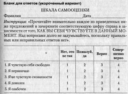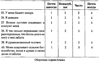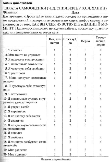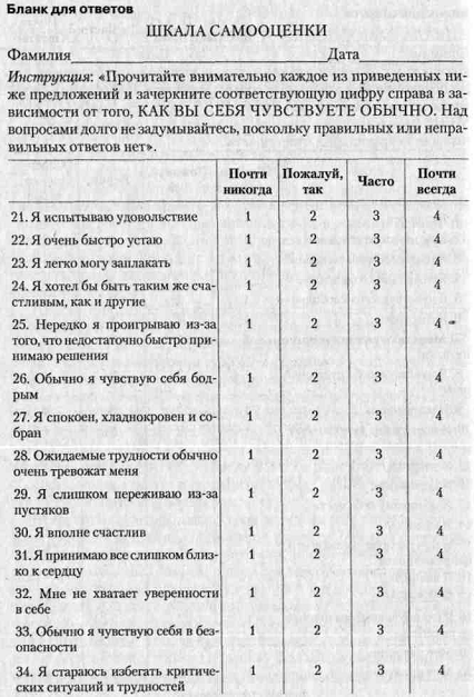 де 2, - сума закреслених цифр на бланку по пунктах шкали 22,23, 24, 25, 28, 29, 31, 32, 34, 35, 37, 38, 40; Е2 - сума інших цифр по пунктах 21,26, 27,30, 33, 36, 39. Інтерпретація отриманих даних. При інтерпретації результат тестування можна оцінювати так: до 30 - низька тривожність; 31-45 - помірна тривожність; 46 балів і більше - висока тривожність.