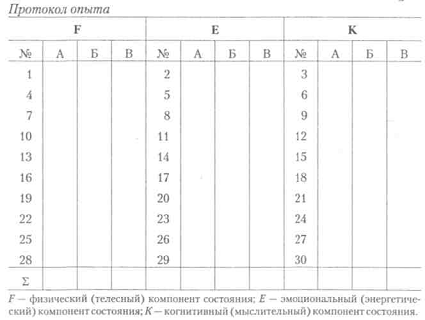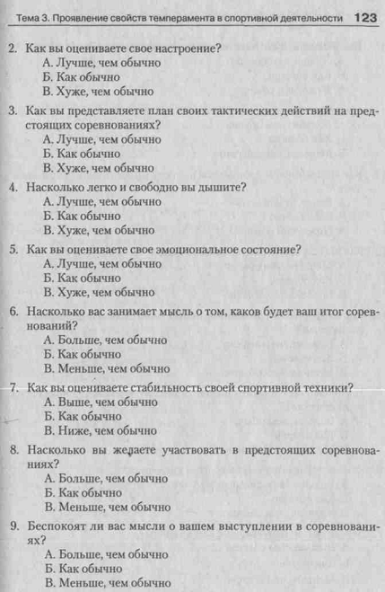 124 Розділ 2. Психологія особистості спортсмена і тренера 10. Як ви оцінюєте відчуття рівноваги в своїх рухах? A. Краще, ніж зазвичай Б. Як звичайно B. Гірше, ніж зазвичай 11. Ви задоволені взаємовідносинами зі своїм тренером? A. Більше, ніж звичайно Б. Як звичайно B. Менше, ніж зазвичай 12. Як ви оцінюєте свої шанси на успіх у майбутніх соревнова пах? A. Вище, ніж зазвичай л Б. Як звичайно B. Нижче, ніж зазвичай 13. Як ви відчуваєте роботу свого серця? A. Менше, ніж зазвичай Б. B. Більше, ніж звичайно 14. Чи задоволені ви взаємовідносинами з найближчими для вас людьми? | A. Більше, ніж звичайно Б. Як звичайно B. Менше, ніж зазвичай 15. Наскільки ви здатні придушити думка про можливу невдачу на змаганнях? A. Більше, ніж звичайно Б. Як звичайно B. Менше, ніж зазвичай 16. Як ви відчуваєте свій шлунок і кишечник? A. Більше, ніж звичайно Б. Як звичайно B. Менше, ніж зазвичай 17. Чи діють оточуючі вам на нерви? A. Більше, ніж звичайно Б. Як звичайно B. Менше, ніж зазвичай Тема 3. Прояв властивостей темпераменту у спортивній діяльності 125 18. Чи багато ви роздумуєте про майбутніх змаганнях? A. Більше, ніж звичайно Б. Як звичайно B. Менше, ніж зазвичай 19. Оцініть почуття координації своїх рухів. A. Краще, ніж зазвичай Б. Як звичайно B. Гірше, ніж зазвичай 20. Ви впевнені в собі? A. Більше, ніж звичайно Б. Як звичайно B. Менше, ніж зазвичай 21. Чи думаєте ви про своїх суперників? A. Більше, ніж звичайно Б. Як звичайно B. Менше, ніж зазвичай 22. Наскільки ви відчуваєте себе в «спортивній формі»? A. Краще, ніж зазвичай Б. Як звичайно B. Гірше, ніж зазвичай 23. Наскільки вам хочеться змагатися? A. Більше, ніж звичайно Б. Як звичайно B. Менше, ніж зазвичай 24. Наскільки ви уважні? A. Більше, ніж звичайно Б. Як звичайно B. Менше, ніж зазвичай 25. Як ви сприймаєте своє «спортивне почуття» (води, зброї, м'ячі, траси, дистанції, жердини, снаряда тощо)? A. Краще, ніж зазвичай Б. Як звичайно B. Гірше, ніж зазвичай 26. Наскільки ви спокійні? A. Більше, ніж звичайно Б. Як звичайно B. Менше, ніж зазвичай 126 Розділ 2. Психологія особистості спортсмена і тренера 27. Чи багато ви думаєте про те, що очікують від вас інші люди у перед стоять змаганнях? A. Більше, ніж звичайно Б. Як звичайно B. Менше, ніж зазвичай 28. Який у вас сьогодні був апетит? A. Краще, ніж зазвичай Б. Як звичайно B. Гірше, ніж зазвичай 29. Наскільки ви тривожитеся через майбутні змагань? A. Більше, ніж звичайно Б. Як звичайно B. Менше, ніж зазвичай 30. Наскільки ви вважаєте майбутні змагання важливими для себе? A. Більше, ніж звичайно Б. Як звичайно B. Менше, ніж зазвичай