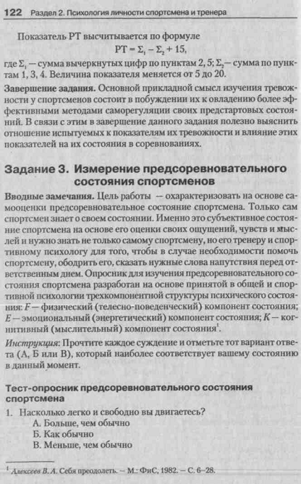 Тема 3. Прояв властивостей темпераменту у спортивній діяльності 127 Аналіз та інтерпретація даних тестування. Сумарний показник за шкалами (F, EHK) показує ступінь вираженості того чи іншого компонента в цілісній структурі психічного стану спортсмена і тим самим дає можливість тренеру (психолога, спортивного лікаря) і самому спортсмену вибору адекватного психологи-чеського прийому або уявного настрою для психокорекції, саморегуляції або оптимізації свого стану. Завершення завдання. Якщо даний опитувальник використовується для діючих спортсменів напередодні змагання, то психолог (тренер, спортивний лікар) зобов'язаний після обробки даних поговорити зі спортсменом і застосувати відповідні професійні прийоми (навіювання, переконання) для оптимізації стану спортсмена. Якщо даний опитувальник використовується в навчальному варіанті для студентів, то викладачеві доцільно обговорити зі студентами наступні питання: 1) Що таке предсоревновательний стрес? 2) Чому у спортсменів перед змаганням часто буває безсоння? 3) Які рекомендації може дати тренер, спортивний психолог (лікар) спортсмену, щоб він добре виспався перед відповідальними стартами у змаганнях?