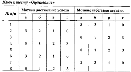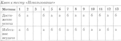 Вступні зауваження. Відмінність у мотивації досягнення успіху і мотивації уникнення невдачі в психологію вперше ввів американський психолог А. Аткінсон. Спостерігаючи за поведінкою учасників спортивних змагань, можна на власні очі переконатися в дії цих двох типів мотивації - досягнення успіху і уникнення невдачі, на прикладах тактико-технічних дій спортсменів, які застосовують те атакуючі, то захисні прийоми боротьби з суперниками заради перемоги у змаганнях. У єдиноборствах, наприклад, прийнято класифікувати учасників змагань по стилю їх змагальної діяльності на: 1) спортсменів атакуючого стилю; 2) спортсменів захисного стилю; 3) спортсменів змішаного стилю. У футболі і в хокеї, наприклад, гравці діляться на нападників, захисників, півзахисників, а воротар команди, по суті своєї ігрової ролі, керується мотивацій уникнення невдачі - головне, не пропустити м'яч у свої ворота. Сурков Є. Н. Мотивація. Психологія спорту в термінах, поняттях, міждисциплінарних зв'язках: Словник-довідник / За ред. В. У. Агеевца. - СПб.: СПбГАФК ім. П. Ф. Лесгафта, 1996. - С. 175. Завдання підготовлено на основі методики Н. Б. Стамбулова «Мотиви поведінки» (див.: Практичні заняття з психології: Учеб. Сел. Для ІФК. - М.: ФиС, 1989. - С. 45-49). 174 Розділ 3. Психологія виховання, навчання і тренування в спорті Вправа 1. Тест «Використання» - '. Інструкція: «Зараз ви повинні висловити свою думку про найкращий спосіб використання вільного часу, грошей, зусиль і т. п. Прочитавши питання, ви повинні вибрати тільки один з двох запропонованих відповідей а або б». Приклад: 1. Якби я отримав премію 600 рублів, то купив би: а) нові туфлі, б) письмовий стіл. Свій вибір відзначайте, закреслюючи ту ° УКВУ (а або б) у протоколі досвіду, яка відповідає вашій відповіді. Працюйте швидко, довго не замислюючись над відповіддю. Перша відповідь, яка приходить вам в голову, зазвичай більш правильний. Шкала тесту «Використання»: 1. У вільний час я охочіше прочитаю про нові способи: а) захисту від інфекційних захворювань; б) підвищення спортивної майстерності. 2. Велика частина стипендії повинна витрачатися на: а) модний одяг; б) смачну їжу. 3. У професії тренера мене приваблює можливість: а) більше дізнатися про закономірності фізичного розвитку; б) займатися справою, гідним загальної поваги. 4. Грошову премію краще використовувати таким чином: а) зберегти на «чорний» день або на випадок хвороби; б) купити батькам небудь потрібне. 5. Робота тренера хороша тим, що дозволяє: а) виявити свої якості керівника; б) навчитися налагоджувати взаємини з людьми. 6. Лікар в команді повинен насамперед дбати: а) про відновлювальні процедурах; б) про попередження травматизму. 7. У хорошому молодіжному журналі повинні друкуватися статті: а) про сучасну музику; б) про сучасних фасонах одягу. 8. Будь я лікарем, я б вважав за краще: а) поїхати працювати у віддалені райони, де немає лікарів; б) витратити свої сили на пошук ліків від раку. Стамбулова Н. Б. Мотиви поведінки. Практичні заняття з психології: Учеб. сел. - М.: ФиС, 1989. - С. 45-49. Тема 2. Вивчення мотивації у підготовці спортсменів 175 9. Я охочіше піду на лекцію про те, як: а) зробити свою квартиру більш сучасною; б) попередити можливість психічного захворювання. 10. Служба в органах міліції дає можливість: а) навчитися прийомам самооборони і володіння зброєю; б) відчувати свій авторитет і вплив. 11. У нау