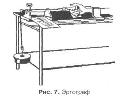 Вступні зауваження. Здатність спортсмена проявляти і розвивати вольові зусилля в стані наростаючого почуття втоми при виконанні фізичних вправ в умовах тренування або виступу в змаганнях є показником розвитку її вольових якостей характеру. При цьому враховується тренованість спортсмена, бо більш тренований спортсмен здатний виконати ту ж фізичне навантаження, що і менш тренований, з меншими вольовими зусиллями. Тому мета і практична значущість даного завдання в тому, щоб навчити студентів або спортсменів саморегуляції і свідомого управління станом напруги вольового зусилля при виконанні фізичних вправ. Вивчення психологічних механізмів вольових зусиль спортсменів в умовах стомлення, що розвивається є завданням спортивної психології та психофізіології спорту. Методика роботи. Для досвіду необхідні два кистьових (пальцевих) Ергографія (рис. 7), електрометрономи, секундоміри і протоколи досвіду. Спрощений варіант досвіду може бути здійснений із звичайними гантелями вагою в 2,5; 5 і 8 кг (2 комплекти). Проводиться демонстраційний експеримент за участю шести випробуваних, двох хронометристів і протоколістів. Моделлю спортивної змагальної діяльності служить робота на Ергографія двох піддослідних. Темп задається електрометрономом в межах 45-60 уд. / Хв. Випробуваний підтягує вантаж в 3-4 кг, торкаючись вказівним пальцем до рукоятки приладу і, розгинаючи палець, тут же опускає вантаж. Замість цього можна утримувати гантелі у правій руці, зігнутою в ліктьовому суглобі під кутом 90 ° і поверненою долонею вгору (передпліччя паралельно підлозі). Потім випробувані розбиваються на пари, приблизно рівні за своїми можливостями. На виконання вправ вступає одна пара за одною. Смирнов Б. Н. Вольові зусилля в спорті. Практичні заняття з психології: Учеб. сел. - М.: ФиС, 1989. - С. 97-99.