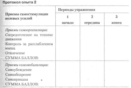 Вправа 1. Пробна спроба Інструкція. «Зараз ми будемо працювати на Ергографія в темпі ударів метронома. Як тільки відчуєте необхідність включення вольового зусилля, припиніть роботу ». Аналогічні вказівки дають і по утриманню гантелі. Час роботи кожного випробуваного в першому досвіді повідомляється всім студентам і записується в протокол 1. Тема 1. Психомоторика і сенсомоторики спортсменів 37 ліберальне суддівство і т. п.) з метою максимальної реалізації вольових зусиль і функціональних можливостей піддослідних. Інструкція. «Вам пропонується брати участь в особисто-командному змаганні із завданням працювати якомога довше свого суперника по парі і цим зробити свій внесок у командну перемогу. Одночасно з роботою вам треба вести самоспостереження за прийомами самостімуляциі вольових зусиль і їх інтенсивністю. Самооцінка прийомів самостімуляциі вашого вольового зусилля здійснюється за чотирибальною шкалою (5 - дуже сильно, 4 - сильно, 3 - середньо, 2 - слабо, 1 - дуже слабо, 0 - не використовував (а) зовсім) на початку, середині і наприкінці роботи » . Дані самооцінки (всього 18 оцінок) заносяться кожним випробуваним в протокол 2 відразу після закінчення другого вправи.