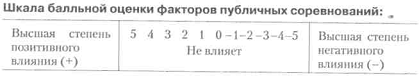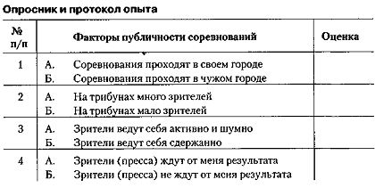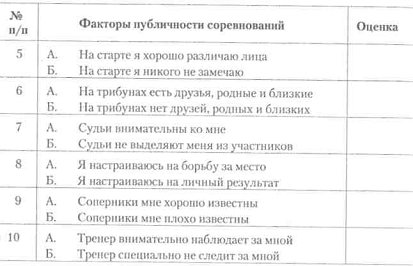 Вступні зауваження. Для цілей і вибору адекватних методів психологічної підготовки спортсменів до майбутнього змагання тренеру важливо знати і враховувати індивідуальні особливості сприйняття спортсменами факторів публічності змагань. Публічність змагань висловлює масову психологію видовища. Натовп спортивних уболівальників-глядачів на стадіоні є своєрідність- 1 Волков І. П., Меньшикова А. Л. Ставлення до змагання / / Практичні заняття з психології: Учеб. сел. для студентів ІФК. - М: ФиС, 1989. - С. 124-125. Тема 4. Вивчення впливу змагань на особистість спортсменів 235 вим «соціальним дзеркалом» для спортсменів, яке сприяє актуалізації у спортсменів передстартових станів. Формування у тренера практичного вміння діагностувати ставлення (установку) спортсмена до умов і факторів публічності змагань є важливим елементом тренерського мистецтва «підводки» спортсмена до змагання. Нижче пропонується опитувальний лист і бальна шкала для оцінок факторів публічності змагань спортсменами. Опитування спортсменів проводиться безпосередньо за 1-2 години до змагань або ретроспективно після змагань. Результати обох варіантів опитування допомагають виявити міру суб'єктивної реакції спортсмена на змагальний стрес. Інструкція. Перший варіант: «Вам пропонується брати участь в психологічному досвіді з метою вивчення установок спортсменів при сприйнятті різних факторів публічних змагань. Відповідаючи на питання, вибирайте відповідь А чи Б і відзначайте свою відповідь в протоколі досліду оцінкою в балах від 0 до 5 ». Другий варіант: «Скористайтеся своїм спортивним досвідом і заповніть опитувальник, в якому в кожній парі тверджень ви можете вибрати або один варіант (А або Б), або можете відповідати на обидва варіанти (А і Б) , відзначаючи свої відповіді в балах від 0 до 5 ». Інструкція для ретроспективної оцінки: «Перш за все згадайте свої старти і уявіть себе на змаганнях. Потім оцініть ступінь значущості або впливу на вас запропонованих в таблиці суджень з біполярної шкалою (див. нижче). Працюйте самостійно ».