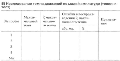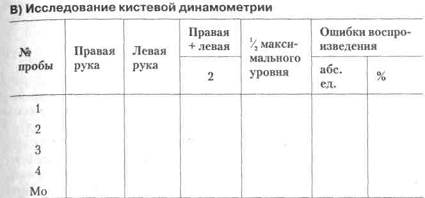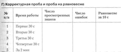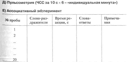 52 Розділ 1. Взаємодія психіки і фізичного тіла Підраховується: 1) середній час реакції на «нейтральні» слова, с; 2) середнє час реакції на «напівспортивні» слова, с; 3) середній час реакції на «спортивні слова», с; 4) число слів-відповідей, пов'язаних з змістом зі спортом. Методика роботи. Всі студенти розбиваються на пари, по черзі обстежують один одного і записують фонові дані в протокол (див. Тремометрія. Тремометр розташовується на рівні грудей випробуваного. Він бере в праву руку (якщо вона «робоча») рукоятку штифта, як олівець при листі (рука зігнута в ліктьовому суглобі і не стосується тулуба), вводить штифт в отвір діаметром 2 мм і тримає його протягом 10 с, намагаючись не торкатися їм стінок отвори і не замикати контакт. Реакція на час. Випробуваний отримує секундомір (треба тримати його так, щоб не бачити циферблату), самостійно (без команди) включає, а коли, на його думку, пройде рівно 7 (6,8) с, вимикає і, не дивлячись на циферблат, віддає експериментатору. ? » Теппінг-тест. Прилад розташовується на столі перед сидячим випробуваним. Він кладе з'єднані пальці правої руки на рухому планку приладу і по команді «Швидко ... гоп! »починає постукувати ними в максимально швидкому темпі. Сигналом для припинення роботи служить команда «Стоп!», Яку подає експериментатор по закінченні 10 с. Потім випробуваному пропонується натискати на планку в темпі, що становить '/, від максимального (тобто вдвічі повільніше). Команда для початку роботи - «Спокійно ... гоп! », для закінчення (через 10 с) -« Стоп! ». Динамометрія. У положенні основної стійки (рука з динамометром пряма і не стосується стегна) вимірюється максимальна сила кисті випробуваного. Потім він стискає динамометр із зусиллям, складовим S від максимального. Корректурная проба. Випробуваному пропонується протягом 2 хв переглянути спеціальну таблицю рядок за рядком, намагаючись швидко і правильно відшукати в них певні, зазначені експериментатором знаки або поєднання знаків, підкреслюючи при цьому одні й закреслюючи інші. Після закінчення кожних 30 з експериментатор подає сигнал «Гоп!» - Випробуваний ставить вертикальну риску в тому місці таблиці, яке він переглядав в момент сигналу. Через 2 хв Тема 2. Спеціальні вправи для вивчення психомоторики 53 подається команда «Стоп!» - Випробуваний ставить дві вертикальні риси і припиняє роботу. Пульсометра. Пульс вимірюється пальпаторно протягом 10 секунд з наступним підрахунком величини «індивідуальної хвилини». Проба на рівновагу. Випробуваному пропонується протягом 10 с утримувати рівновагу в положенні стоячи на одній нозі, інша попереду, руки вгорі, очі закриті. Асоціативний експеримент. Попередньо дається спеціальна інструкція: «Відповідайте якнайшвидше на кожне вимовлене мною слово будь-яким словом». Слова-подразники експериментатор підбирає перед експериментом так, щоб серед них були, чергуючись у випадковому порядку, 7 слів, не пов'язаних зі спортивною діяльністю випробуваного й емоційно незначущих - «нейтральних»; 6 слів, які можна зрозуміти і як пов'язані зі спортивною діяльністю, і як не пов'язані з нею - «напівспортивні» (наприклад, «поле», «обертання», «дихання», «хвилина»), 7 слів, пов'язаних за змістом з змаганнями з виду спорту, в якому спеціалізується випробуваний. Експериментатор включає секундомір відразу ж після проголошення слова-подра