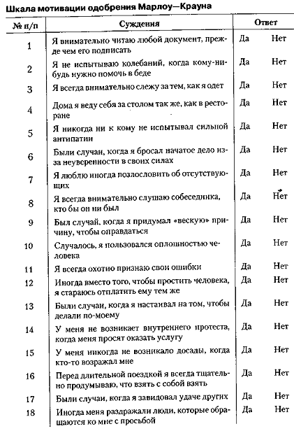 Вступні зауваження »Мета даного завдання - ознайомлення молодих спортивних фахівців-тренерів з простим методом діагностики мотивації спортсменів, орієнтованих у своїй спортивній діяльності на схвалення з боку тренера. У досвіді використовується шкала мотивації схвалення Д. Марлоу і Д. Крауна. Порядок роботи. Досвід може бути груповим або індивідуальним. Піддослідні отримують бланки зі шкалою схвалення і діють відповідно з інструкцією. Інструкція. «Уважно прочитайте кожне з наведених нижче суджень. Якщо ви вважаєте, що воно вірно і відповідає особливостям вашої поведінки, закресліть "Так", якщо ж воно невірно, закресліть "Ні" ».