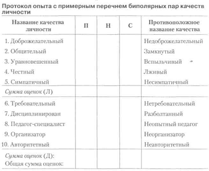 Вступні зауваження. Педагогічна мета завдання полягає в ознайомленні студентів з методом оціночної біополярізаціі і в навчанні їх умінням дослідницької роботи за допомогою цього методу для вимірювання оціночних стереотипів сприйняття і розуміння тренером себе та інших людей у спільній роботі і в спілкуванні зі спортсменами. Даний тест, як показує дослідницька практика у сфері спорту, можна з успіхом застосовувати також і для психодіагностики схильності тренера до того чи іншого стилю керівництва, а також для вивчення особливостей структури його самосвідомості за показниками самооцінки. Методика дослідження. Для оперативної кількісної обробки результатів групового експерименту необхідний електронний калькулятор. Тест складається з набору біполярних якостей особистості, значущих для тренера по його роботі з точки зору успішності впливу в спілкуванні з партнерами: а) як товаришами по міжособистісному спілкуванню (особистісні якості), б) як співробітниками по спільному справі - роботі (ділові якості). Зазвичай набір біполярних якостей в одному досвіді не перевищує більше 20 протилежних за змістом якостей: негативна якість відтіняє значення позитивної якості, що робить його оцінку більш точної (так звані прикметники антоніми, наприклад «чесний-брехливий). Інструкція. «Перед вами набір біполярних якостей особистості. Виразність кожного біполярного якості оцінюється за допомогою 10-бальної шкали: