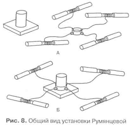 Опис методики. Установка Румянцевої (рис. 8) складається з двох основних частин: полого металевого стержня, укріпленого на обтяженою металевій платформі, і металевого кільця, по колу якого рівномірно розподілені 4 отвори з різьбленням. У них вкручуються 4 невеликих болта із закріпленими на них капроновими нитками (тонка мотузка, шпагат та ін.) довжиною від 4 до 6 м. Інший кінець нитки забезпечений металевими або дерев'яними ручками для захоплення їх випробуваними. У вихідному положенні перед вирішенням завдання нитка намотана на ручки. Методика роботи. Досвід груповий. Студенти розбиваються на експериментальні групи по 4 людини. Призначаються 2 асистента. Кожна експериментальна група отримує 1 тренувальну і 1 контрольну спробу. Інструкція А: «Одягти кільце на стрижень якомога швидше. Фіксуються час і число помилок ». Інструкція Б: «Одягти кільце на стрижень якомога точніше. Фіксуються помилки і час ». Завершення роботи. Результати експерименту в кожній групі піддаються статистичній обробці. Потім проводиться порівняльний аналіз показників за кількома групами. Визначаються фактори, що вплинули на досягнутий рівень психомоторної сумісності в кожній групі, і наявність в ній ділових і емоційних лідерів.