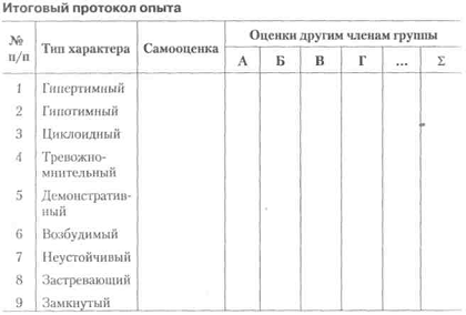 Вступні зауваження. Мета і практична значимість даної роботи полягає у визначенні типів характеру спортсменів, знання особливостей якого допомагає взаєморозумінню між людьми. Піддослідним пропонується ознайомитися з 9 типами характеру, риси якого проявляються в їх спілкуванні і в спільній діяльності з іншими, в тому числі в процесі занять спортом: 1) гіпертімний, 2) гипотен-ний, 3) циклоїдний, 4) тривожно-недовірливий, 5) демонстративний, 6) збудливий, 7) нестійкий, 8) застревающий, 9) замкнутий (самодостатній). Опис даних типів характеру дано в роботах К. Леонгарда (див. нижче), С. І. Подмазін, Е. Г. Ейдеміллер та ін Стомлений матеріал2 1. За характером я оптиміст. Настрій у мене завжди веселе. Виникають життєві труднощі - я не падаю духом, зберігаю життєрадісність і впевненість в успіху. Життєві негаразди переношу легко, та й по-справжньому серйозні неприємності бувають у мене рідко. Зазвичай вони виникають через мою підприємливості та активності, схильності до вигадок і витівок. У школі у мене була репутація пустуна. Вчився я добре, але не тому, що намагався, а тому, що мені все вдавалося легко. У мене хороша пам'ять, і я швидко міркую, я не мовчун, з задоволенням беру участь у бесідах і дискусіях. Люблю бувати на людях, у компаніях. Зі мною охоче дружать, мені наслідують і мене слухаються. До друзів і подругам ставлюся тепло, беру активну участь в їхній долі, охоче всім допомагаю, легко даю в борг гроші і так само легко сам залазив у борги. Бажаючи всім допомогти, роздаю багато обіцянок, більше, ніж можу виконати. Не виношу одноманітну, копітку роботу, яка вимагає посидючості. Мене постійно тягне до нового, до гострих, несподіваним і ризикованим ситуацій. Загалом, я мало кого можу поставити вище себе. 2. За характером я песиміст. Настрій у мене майже завжди знижений. Світ я сприймаю як крізь темні окуляри; ніяк не можу Мельников В. М., Ямпільський Л. Т. Діагностика типів акцентуації характеру / / Практичні заняття з психології: Учеб. сел. - М.: ФиС, 1989. - С. 41-44. 2 Ейдеміллер Е. Г. Метод аутоидентификации й ідентифікації по словесним характерологическим портретам і його клінічна апробація / / Патологія порушення поведінки підлітків. - Л.: НДІ ім. Бехтерева, 1978. - С. 93-99. 86 Розділ 2. Психологія особистості спортсмена і тренера позбутися відчуття, що ось-ось може статися щось погане. Постійно мені здається, що я в чомусь винен, що роблю щось не так, як слід, що я гірше інших. Тому зазвичай я сторонюся людей, уникаю компаній, друзів у мене мало. Однак у колі близьких друзів життя робиться для мене більш світлою. Я охоче обговорюю з ними свої особисті проблеми: звертаюся до них за допомогою і сам завжди допомагаю їм чим можу. Я вважаю, що в житті занадто багато труднощів, боротися з якими у мене не завжди вистачає сил. Здоров'я у мене теж не дуже хороше. Особливо погано себе почуваю вранці, прокидаюся з відчуттям розбитості, несвіжості. Життя моє важка й напружена, іноді приходять в голову думки про її помилковість і порожнечі. 3. За характером я динамічний чоловік. Основною особливістю мого характеру є часта зміна настрою. В одні періоди свого життя я тривалий час відчуваю себе дуже добре, відчуваю прилив сил, з апетитом ем, добре сплю, багато й успішно працюю, ходжу на вечірки, в кіно, беру участь у колективних заходах. У цьому стані у мене все ладиться, легко переношу небудь неприє