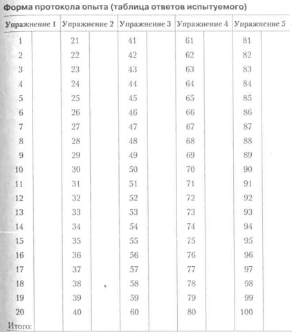 Вступні зауваження. Розумових здібностей, що вивчаються психологами, дуже багато. Нижче пропонується адаптований варіант методики відомого німецького психолога Амтхауера для визначення основних з них. Він складається з п'яти вироблених тестів, кожен з яких містить по 20 питань. Кожне питання в тесті являє собою незакінчену пропозицію, в якому бракує за змістом останнього слова або останньої цифри. Випробуваний повинен вибрати це слово з п'яти запропонованих для кожного питання або закінчити 1 Див: Короткий психологічний словник / Упоряд. Л. А. Карпенко; Під. ред. А. В. Петровського, М. Г. Ярошевського. - М.: Политиздат, 1985. - С. 119. Тема 1. Вивчення інтелектуальних властивостей займаються спортом 65 пропозицію цифрою. Загальна форма протоколу досвіду для всіх 5 вправ додається нижче. Важливо також врахувати швидкість виконання завдань, для чого необхідний секундомір.