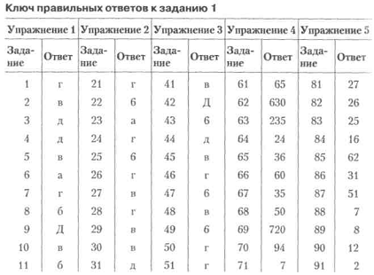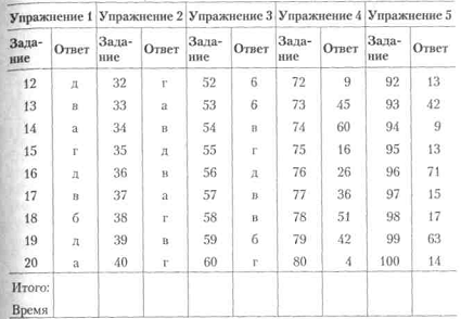 Методика роботи. Перше, що потрібно зробити випробуваному, - це на Чистому аркуші паперу намалювати таблицю - форму протоколу досвіду - 5 стовпчиків по 20 рядків у кожному (див. зразок вище). У комірки таблиці випробуваний буде вписувати відповіді на питання тесту. 66 Розділ 2. Психологія особистості спортсмена і тренера Більш детальні інструкції випробуваному і зразки правильних рішень даються в кожному із завдань п'яти розділів тесту. Кожна вправа у вигляді списку з 20 питань пред'являється випробуваному тільки після того, як він ознайомився із зразком варіанту правильної відповіді. На виконання тестових вправ випробуваному відводиться певна кількість часу. За цей час випробуваному, швидше за все, не вдасться знайти всі правильні рішення, він може хвилюватися і навіть турбуватися через це. Надмірні емоції випробуваного можуть ускладнювати прояв його розумових здібностей так само, як їх повна відсутність. Для стандартизації умов досвіду експериментатор зобов'язаний сказати випробуваному перед початком досвіду: «Працюйте спокійно і уважно, виконуйте завдання в тому порядку, в якому вони розташовані. Якщо для чергового питання ви не можете знайти відповідь, не затримуйтеся на ньому занадто довго, переходите до наступного питання ». Вправа 1. Поінформованість ума1 Інструкція: «Прочитайте пропозицію і виберіть із запропонованого списку то слово, яке, на вашу думку, найкраще підходить для смислового оформлення та завершення пропозиції. Пам'ятайте: пропозиція має бути завершено одним словом. Працюйте швидко ». Зразок рішення: 1. Кролик більше всього схожий на ... а) кішку, б) білку, в) зайця, г) лисицю, е) їжака. Можливий правильну відповідь: в) на зайця (поставте букву "в" в таблицю форми протоколу досвіду в першому стовпчик праворуч проти номера питання). Відзначаючи відповідь у протоколі досвіду, пам'ятайте, що після кожного питання в стовпчик таблиці відповідей потрібно вписувати лише одну букву (або цифру), так як у всіх завданнях з кожного питання можливо тільки одне рішення. Якщо зрозумілі умови досвіду, включіть секундомір (засічіть час) і приступайте до роботи. Зупиніть секундомір (зафіксуйте час), коли виконаєте перше завдання ». На першу вправу випробуваному відводиться 6 хвилин. Дана вправа вимірює і розвиває таку якість розуму, як його обізнаність. 1 Див: Миколаїв А. Н. 7 відповідей на 7 питань. - СПб.: Крістмас, 1996. - С. 4-16. Тема 1. Вивчення інтелектуальних властивостей займаються спортом 67 Перелік запитань (вправа 1): 1. У дерева завжди є ... А) листя, б) плоди, в) нирки, г) коріння, д) тінь. 2. Коментар - це ... А) закон, б) лекція, в) пояснення, г) слідство, д) натяк. 3. Протилежністю зради є ... А) любов, б) дармоїдство, в) хитрість, г) боягузтво, д) відданість. 4. Жінки бувають вище, ніж чоловіки. А) завжди, б) зазвичай, в) часто, г) ніколи не, д) іноді. 5. Обід не може відбутися без ... А) столу, б) сервізу, в) їжі, г) води, д) голоду. 6. Заняттям, протилежним відпочинку, є ... А) праця, б) турбота, в) втома, г) прогулянка, д) тренування. 7. Для торгівлі необхідно мати ... А) магазин, б) гроші, в) прилавок, г) товар, д) ваги. 8. Коли суперечка закінчується взаємної поступкою, це називається ... А) конвенцією, б) компромісом, в) розв'язкою, г) змовою, д) примиренням. 9. Людину, яка погано ставиться до нововведень, називають ... А) республіканцем, б) лібералом, в) демократом, г) радикалом, д) консервато