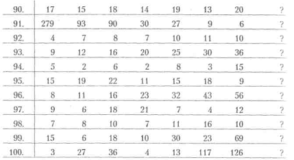 На цю вправу випробуваному відводиться 10 хвилин. Вимірюється здатність розуму порівнювати величини, знаходити кількісну закономірність (пошук і знаходження закономірності).