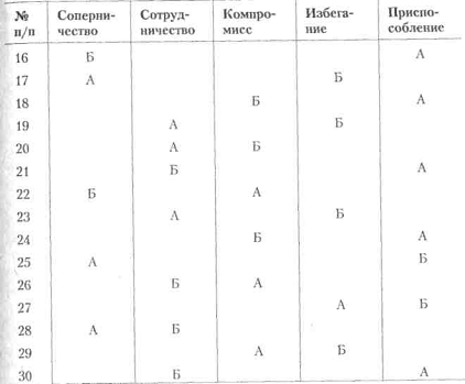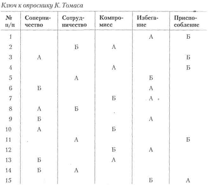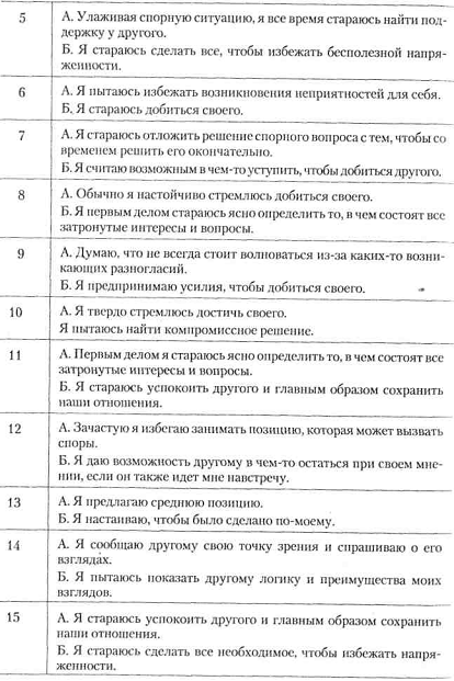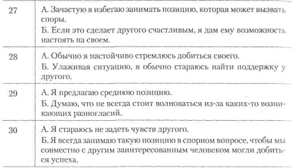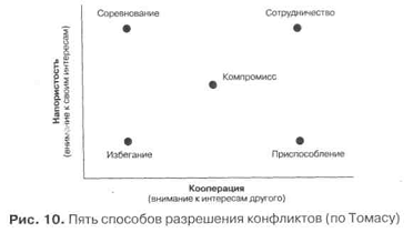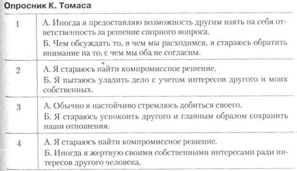 Вступні зауваження. Для виявлення схильності людини до конфліктних взаємин у спільній спортивної діяльності застосовується тест Томаса, адаптований в нашій країні проф. Н. В. Гришиної. У своєму підході до розуміння причин конфліктів К. Томас вважає застосовувану двомірну модель регулювання конфліктів, основними вимірами в якій є кооперація, пов'язана з увагою людини до інтересів інших людей, залучених в конфлікт, і напористість, для якої характерний акцент на захисті власних інтересів. Відповідно до цих двох основних вимірах К. Томас виділяє наступні способи регулювання конфліктів: 1) змагання (конкуренція) як прагнення домогтися задоволення своїх інтересів на шкоду іншому; 2) пристосування, що означає в протилежність суперництва, принесення в жертву власних інтересів заради іншого; 3) компроміс; 4) уникнення, для якого характерно як відсутність прагнення до кооперації, так і відсутність тенденції до досягнення власних цілей; 5) співпраця, коли учасники ситуації приходять до альтернативи, повністю задовольняє інтереси обох сторін. К. Томас вважає, що при уникнення конфлікту жодна зі сторін не досягає успіху. При таких формах поведінки, як конкуренція, пристосування і компроміс, або один з учасників виявляється у Гришина Н. Тема 1. Міжособистісне спілкування в спортивній діяльності 201 виграші, а інший програє, або обидва програють, тому що йдуть на компромісні поступки. І тільки в ситуації співробітництва обидві сторони виявляються у виграші.