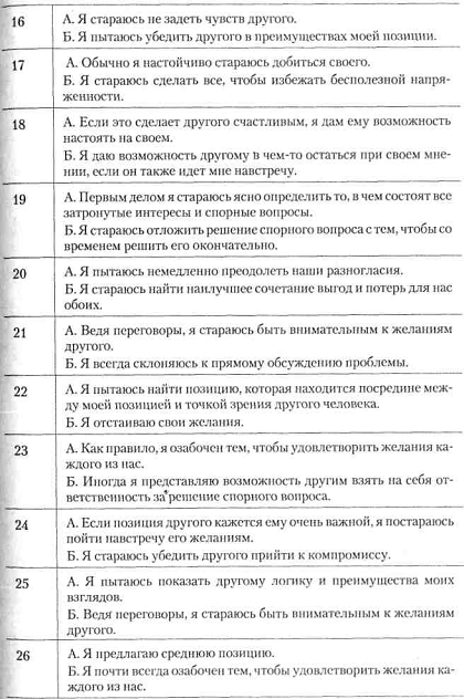 У своєму опитувальнику по виявленню типових форм поведінки К. Томас описує кожний з п'яти перерахованих можливих варіантів в 12 судженнях про поведінку індивіда в конфліктній ситуації. У різних поєднаннях вони згруповані в 30 пар, у кожній з яких респонденту пропонується вибрати те судження, яке - є найбільш типовим для характеристики його поведінки.