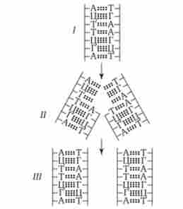 / - материнська біспіралью ДНК; II - добудовування комплементарних полінук- леотідних ланцюгів; III - дві дочірні биспирали ДНК; А, Т, Г, Ц - символи азотистих основ нуклеотидів
