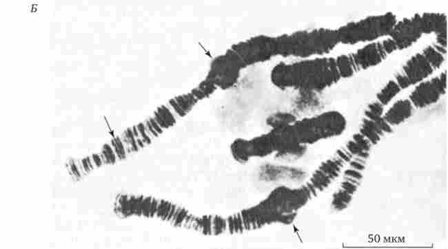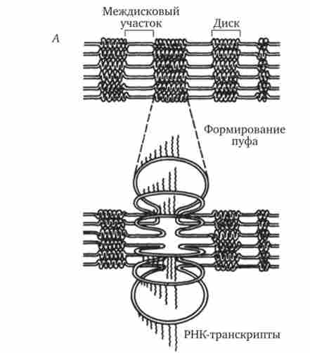 Б - електронограмма політенних хромосом слинних залоз комах. Стрілки, що показують місця пуфів